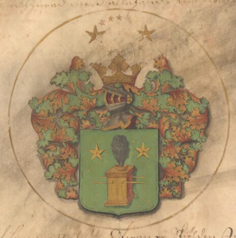 ”… een grön Skiöld, hwaruthj står ett Röökaltar af Gull; Öfwer detta Altaret lysa twenne Stiernor iembwähl af Gull, och är elliest Skiölden öfwerströdd och uthzijrad medh allahanda små blomster och Rooser af samma metall. Ofwan på Skiölden står een öpen Tornerhielm beprydd medh een Gylden Crona; Hwar öfwer är een Crantz bestående af twenne stoora och dee öfrige små Stiernor af Gull; warandes Löfwärket af Gull och grönt, aldeles som sielfwe Wapnet här ofwan före egenteligen afmåhlat finnes.”