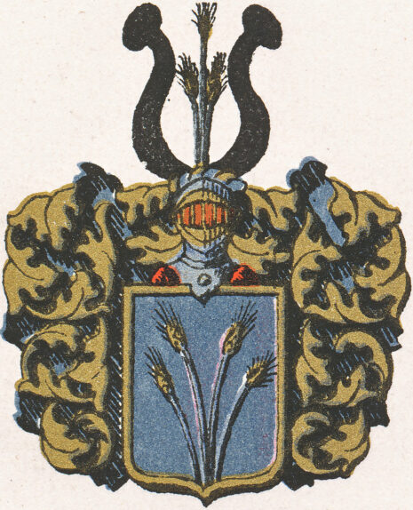 … Vthi ett Blott Fieldh, fyr oförgylta Rogax der på en öpin Tornerehielm, Täcken och Crantzen medh Blått och guhltt fördelte; ofuan på Hielmen tree förgylte Roghax, emillan tu Swartha Torn, aldeleβ såsom dett medh sine egentelighe färgor här repræsenterat och affmålt står;…..