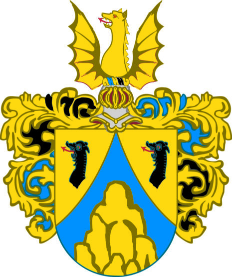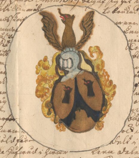 ”… en Skiöld fördelt i twenne Krumme Linier ifrån ofwan til begge sidorne twenne fält eller delar, twenne öfre delarne af Gull botten med ett swart drakahufwud i hwardera delen det undra fältet blått med et gull berg nedan uti. Ofwan på Skiölden en öpen Tornerehielm hwar öfwer en half draka, med sina wingar af gull färga. Krantsen och Löfwärcket af Gull swart och blå ferga. Aldeles som sielfwa Wapnet med sine egentelige färgor här hos står målat ock afsatt.”