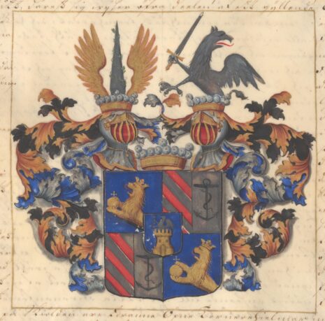 ”… en Skiöld, fördeelt i Fyra fält och mit uti den samma deβ förre Adelige Wapen, som är en gyllene borg i blåt Fält, hwarutur upstijger öfre deelen af en Sölfwerfärgat Grijp, hållandes en nyckel af Sölfwer i högre Rahmen: Af sielfwa Frijherre-Wapnet, är det första Fältet blått, därest sig wijsar öfra deelen af ett gyllende Leijon, hållandes ett Äple af samma färg emellan Rahmarne. Det andra Fältet, som i längden utj twänne lijka dehlar fördelt är, af Sölfwer i deβ högra dehl stå twänne röda Bander, sampt i deβ wänstra, ett Swart Ankar omweklat med en swart Orm. Det tredie Fältet, är öfwer alt lijkt med det andra så och det fierde med det första. Ofwan på Skiölden äre twänne Öpne Tornerehielmar med twänne Frijherre Cronor, sampt de emellan hwardera hielmen, uppå den högre HielmCronan står en Pyramid af Sölfwer med en grön Lagerqwist omweklat, emellan twänne Wingar af Gull, som det till förende öfwer deβ Adelige Wapen brukat är; Uthur den Wänstra Hielm Cronan öfre deelen af en Sölfwerfärgat och till baka seende Grijp, hållandes ett bart Swärd i högre Rahmen, sampt Een grön Crantz i Munnen. Löfwärket är af blått, Gull, Sölfwer och Swart; Aldeles som sielfwe Wapnet med sina egenteliga Färgor här hoos representerat och afmåhlat står.”
