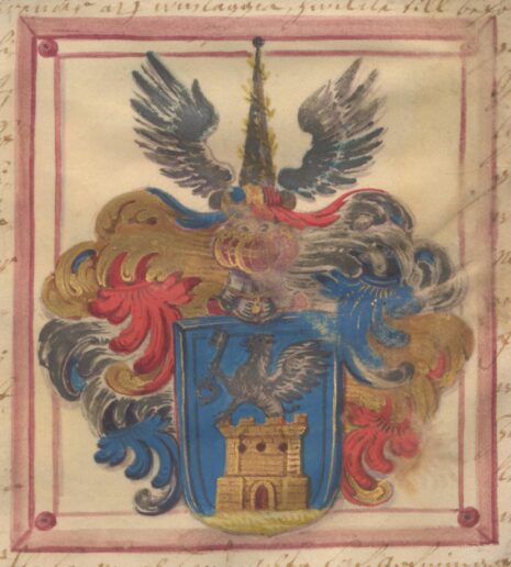 ..vthi ett blått fält een guul borg, och den uppå een halff hwijt Grijp, hållandes een Nyckell uthi högra Kloon, på Hiälmen een spitz aff een piramide omweckladh medh een grön ranck emellan twenne guula Grijps wingar, alldeeles som det här medh sina rätta färgor uthsatt och affmåhlat är….