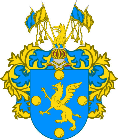 ”… En blå Skiöld, hwaruthi ståår en Gahm eller Grijp af Gull emillan Fyra Kuhlor af samma Metall: Åfwan på Skiölden står en öpen Tornerhielm, hwarutur upstijger Hufwudet af en Sådan Grijp, som i sielfwa Skiölden, emillan Fyra Estandarer med Gull och blått hwar om annan fördelte; Krantzen och Löfwercket är jemwell af Gull och Blått, alldeles som sielfwa Wapnet med deβ egentel. färgor, här hoos finnes afmåhlat.”