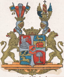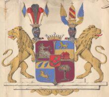 ”… En, med ett utböjdt korss af silfver, fyrdelad Sköld, belagd med en med en silfverkant omgifven hjertSköld. Uti första fältet, af purpur, synes på en antik stol, en åt venster vänd sittande Qvinnobild, hållande i venstra handen en wigt-skål, samt i den högra ett nedåt wändt bart svärd, hvarjemte bakom bilden ligger ett Lejon, hvaraf blott hufvudet, hviladt mot framföttren, åt höger framskjuter; altsammans af silfver, och föreställande Rättvisans sinnebild eller Insignierne af Kongl:l Götha hofrätt. Andra fältet är i tvären fördeladt i tvänne lika delar, varandes den öfra afdelningen blå med ett förgyldt Lejon, och den nedra af guld, hvaruti står ett rödt hus. Tredje fältet är blått, hvari visar sig en springande betslad häst af guld, och deröfver en Chef, jemväl af guld, sirad med ett par blå wingar. I fjerde fältet af purpur, står ett Palmträd af silfver. Uti hjert-Skölden, som är röd, synes en beväpnad Arm, hållande ett Standar, båda af silfver. På Skölden hvilar en Friherrlig krona emellan tvänne öpna Torner-hjelmar, likaledes med Friherrliga kronor prydda. Ofvanpå högra hjelmen stå tvänne Standarer af blå färg, prydda med guld-fransar och toffsar, samt hvilkas stänger äfvenledes äro af guld. Emellan dem äro uprätt ställde två röda fjädrar och i midten en hvit. På venstra hjelmen visar sig emellan tvänne utslagna Wingar, den högra nederst blå och öfwerst af guld, samt den wenstra nedantill af guld och ofvantill blå, en röd Obelisk, ställd på tvänne kulor af guld uppå en gyllene Piedestal, samt belagd med trenne gyllene bander, deremellan, i öfra mellan-rummet, visar sig twå och i det nedra, tre Rosor af silfwer. Skölden, som står på en Fotställning af marmor, nederst prydd med gyllene sirater, uprätt-hålles af tvänne gyllene Lejon. Alldeles som detta Wapen med sina rätta och egentliga färger här frammanföre afmåladt finnes.”