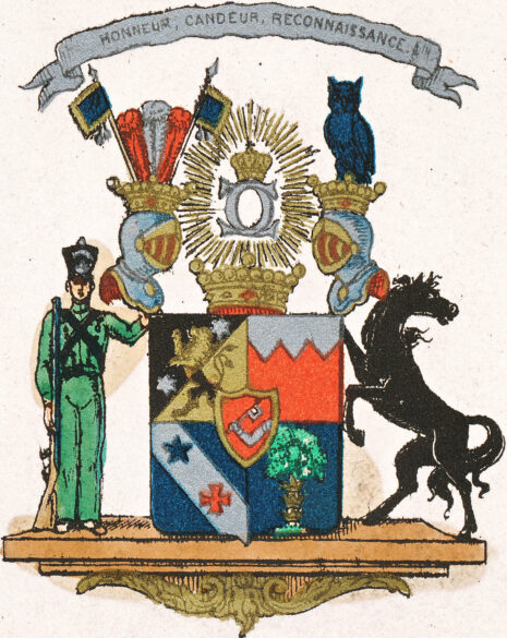 ”. . . En med en gyllene kant omgifven och med sexton naglar dervid fästad fyrdelad Sköld, belagd med en likaledes med en kant af guld omgifven hjert-sköld. Uti högra fältet, som från venster uppåt samt nedåt till höger är på snedden afdeladt, visar sig ett åt höger springande Lejon, med öfra delen af guld, i svart fält och nedra delen svart i guld-fält, emellan tvänne sexuddiga stjernor, den ena under venstra framfoten och den andra bakom hufvudet. Det venstra fältet är fördeldt i tvänne genom en Såg-skura af trenne nedgående uddar, varandes det öfra af dessa tvänne fält af guld och det nedra rödt. Tredje fältet, af blå färg, är från högra öfra hörnet till det nedra venstra belagdt med en balk af silfver, hvilken är ofvantill märkt med en blå femuddig stjerna, och nedantill med ett rödt korss. Uti det fjerde fältet, som är blått, visar sig ett grönskande träd, med trenne kronor öfver hvarandra omkring stammen. Uti hjert-skölden, som är röd, synes en beväpnad Arm, uprätt hållandes en blå Standart. Ofvanpå Skölden hvilar en Friherrlig krona emellan tvänne öpna torner-hjelmar, äfvenledes med Friherreliga kronor prydde. Öfver den mellanstående kronan, glindrar Hans Maj:t Konung Carl XIV:s höga namn-chifre, af guld, prydd med en Kongl. krona och omgifven af en gyllene strålkrans. På högra Hjelmen synas tvänne Standarter af blå färg, emellan hvilka äro upprätt satte två röda fjädrar och en hvit. Uppå den venstra hjelmen hvilar en Uggla i naturlig Färg. Skölden står på en fotställning af sten, med derunder anbragte gyllene Sirater; samt uppehålles af tvänne Sköldhållare, varandes den högra en Fält-jägare af Kongl. Jemtlands Regemente, och den venstra en emot Skölden upprättstående Springare af brun färg, med tillbaka vändt hufvud. Öfver hjelmarne synes en utvecklad Bande, med inskrift: Honneur, Candeur, Reconnaissance, i gyllene bokstäfver. Aldeles som detta Wapen med sina rätta och egentliga färger här frammanföre afmåladt finnes.”