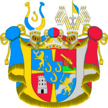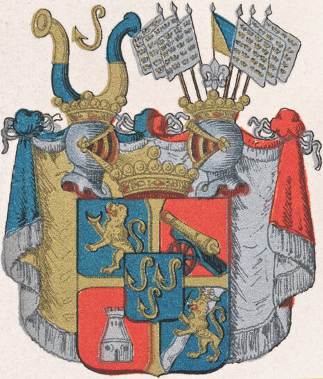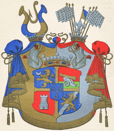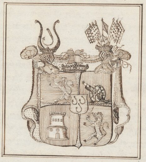 ”… En genom ett gyllende utböjt Korss fyrdelad Skiöld, mitt uppå belagd med dess förra Adeliga Stam Wapn, hvarutinnan i blått Fält ses Trenne till höger vände gyllende Mete krokar 2. och 1. stäldte. Utaf Friherre Wapnet är det första Fältet blått, och deruti ett mot höger gående gyllende Leyon, hållande i högra Ramen en växande Half-måne af Silfver. Uti det andra eller öfversta Fäldtet till vänster, som är rödt, ses en uppå sin Lavette emot höger ricktad gyllende Canon, hvilande uppå en grön marck. Det Tredje eller nedra högra Fältet är rödt, och deruti ett fritt stält Castell af Silfver: Samt uti det Fjerde eller nedra Fäldtet på Wänster, som är blått, sees ett mot höger gående gyllende Leyon, med Crona bekrönt, sträckande sig öfver en Barrevis löpande Ström af Silfver, och hållande i högra Ramen ett Svärd af Silfver med gyllende Fäste. Uppå Skjölden äro Tvenne öpne med Friherre Cronor betäckte Tornere Hielmar, och emellan dem ses uppå Skjölden en större Friherre Crona. Utur den högra hjelmen upstiga Tvenne af Guld och blått tvärdelade Buffelhorn, och imellan dem ses en gyllende Mete-krok. Uppå den vänstra hjelmen är en Stor Fransk Lillja af Silfver, och deröfver en Fahna Bande-vis delad med blått och Guld, åtfölgd å hvardera Sidan af Trenne utåt blåsande Silfver Fahnor, hvardera beströdd med Sexton gyllende Cronor. Wapentäcket är till höger blått, underfodrat med Guld, samt till Vänster Rödt underfodrat med Silfver, kantat och upbundit med gyllende Frantzar och Snören. Aldeles som det samma här frammanföre med sina rätta och egenteliga färgor afmålat finnes.”