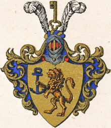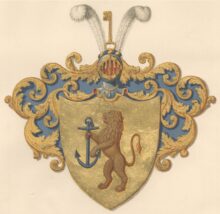 ”… En Engelsk Sköld af Guld, hwaruti ses ett uprättstående til höger wändt Lejon af Naturlig färg, med uprest swans, hållande i högra ramen ett blått Ankare. Skölden prydes af en öppen Tornerhjelm, hwaruppå en Gyllende Nyckel är uprätt stäld med axet upåt, emellan twänne hwita Struts-fjädrar; och omgifwes Skölden af Löfwerk, utwändigt af Guld, undertil blått. Hjelmkransen är wriden af samma färgor; alldeles som det med sina rätta och egenteliga färgor här afmåladt finnes.”