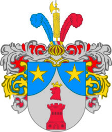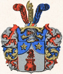 ”… En Skiöld genom twänne ifrån sidorna spitzigt upföre sammangående bögda Strek fördelt i trenne delar, warandes det medlersta Fältet af Silfwer, hwaruti står en röd Borg under ett krönt Hanehufwud af samma Färg, och uti hwardera af dhe bägge yttra Fälten, som äre blå, lyser en Stierna af Gull. Ofwan på Skiölden står en öpen Tornerhielm, uppå hwilken wisar sig en af de gamla Romares Fasces af Gull, emellan en blå och en röd Struszfiäder. Krantzen och Löfwerket är af Gull, Silfwer, blått och rödt, aldeles som detta Wapen med sina egenteliga färgor här hos afmålat står.”