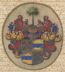 ”… en twert och endelångt i fyra lijka dhelar afdeelt skiöldh, uti hwilckens högre öfre och wenstre nedre dehlar ähre twenne rödha korswijβ lagde hambrar uti hwitt feldt och wenstre öfre och högre nedre dehlar en blå ströhm uti guhlt feldt; ofwan på Skiölden en öpen Tornerehielm, hwarpå står et grönt Lindeträ; Kranzen med hielmtecket och Löfwärcket, blådt, guhlt, hwitt och rödt under hwartannant fordeelt, aldeles som sielfwe wapnet härhooβ finnes afmåhlat och med sine rette färgor tecknat; …”