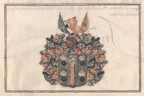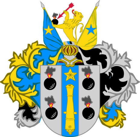 ”… En Skiöld af Silfwer, i hwilken sees en blå Pal emellan Fyra brinnande swarta granate-Kulor. Sielfwa Palen är Zirad med en Stierna af Gull ofwan för ett förgyldt Stycke, som wänder Mynningen upåth. Ofwan på Skiölden står en öppen Tornerhielm, hwarutur sträcker sig öfre delen af ett förgylt Leyon, som fattar med högra Ramen en röd Pijl, och med den wänstra en äfwen slik Kula som i siefwa Skiölden. På hwardera sidan om Leyonet är en hoopdragen Fahna, den högre blå, och den wänstre af Gull, hwardera beprydde med en Stierna, som skifftar sig emot Metallen och couleuren. Crantzen och Löfwerket är af Gull, Silfwer, blått och swart, aldeles som detta Wapn med des egenteliga Fägor här hoos afmålat finnes.”