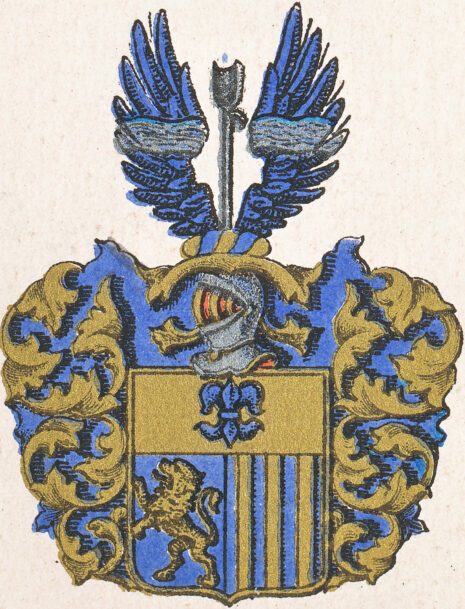 ”… Skiölden fördeelt i Längden utj twenne lijka deelar, dhet högra fältet är rödt, hwarutj står ett Leijon af Gull, dhet wänstra fältet blått med Trenne paler af Gull, öfwer begge fälterne är een chef af Gull, hwari wijsar sig een blå Lillia, ofwan på Skiölden står een öppen Tornerhielm, hwaröfwer är een oprätt Herdestaf emellan ett pahr blå wingar, hwardera med een Silfwerfärgat Ström Zijrade, Crantzen och Löfwärket är af Gull och blått, aldeles som detta Wapnet med sine rätte och egentelige färgor här hoos repræsenterat och afmåhlat står; …”