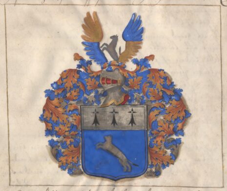 ”… En blå skiöld, hwaruthi wijser sig en springande Hermelin af Sölfwer, och dheröfwer en Chef af samma Metall, zijrat med trenne herminer. Åfwan på Skiölden står en öppen Tornerhielm, hwaruthur upstijger öfre dehlen af en hermelin af Sölfwer emellan ett par wingar med gull och blått hwarom annan fördelte. Krantzen och Löfwärcket är af gull, Sölfwer och blått, aldeles som hoos stående Wapen med deβ rätta färgor afmåhlat uthwijsar och föreställer.”