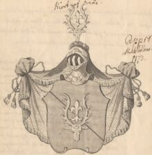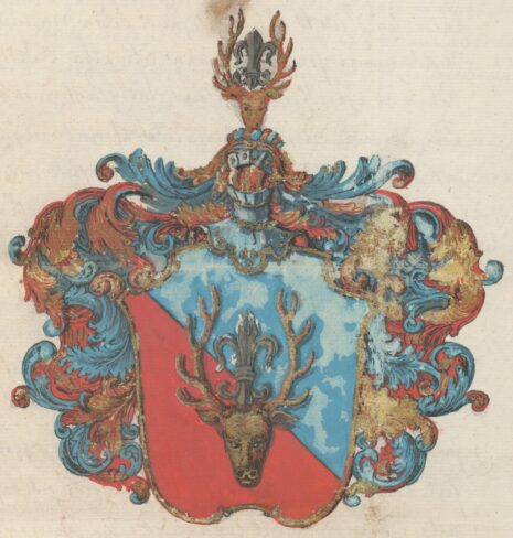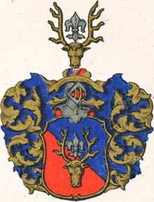 ”… En af Blått ofwan, och Rödt nedan, Bandewis styckad Skjöld, hwaruti förekommer ett Hiorthufwud, som warit Hiorte-Ättens fordna egenteliga Skjöldemärcke. Samma Hjortehufwud är af Guld, med Fem Sticklar på hwardera Hornet, och emellan Hornen tillägges nu en Fransk Lillja af Silfwer. Ofwanföre ses en Öppen Tornerehjelm, hwaruppå ett likadant Hjorthufwud som i Skjölden af guld med tillagd Lillja af Silfwer är upstäldt. Hjelm Krantsen är wriden af Guld och blått, samt det Skjölden omgifwande Löfwärcket likaledes af Guld och blått. Aldeles som det samma här, med sina rätta Färgor afmålat finnes.”