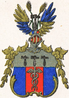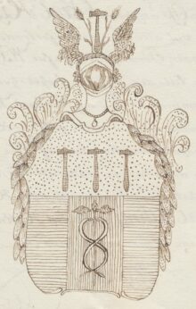 ”… En Swensk Sköld med en Gyllene Chef, som däraf intager en tredje-del, och föreställer trenne med skaftten nedwända Hamrar i bredd: därunder är Skölden 2.gånger lika klufwen, ytterst, på hwardera sidan, blå, och uti den medlersta delen, som är Röd, wisar sig en Mercurii Staf af Silfwer. Ifrån den öpna Tornerhjelmen upstiger en swart hammare, beledsagad af 2.e Gyllene Sädes-Ax, hwardera med 2.e Gröna blad, imellan 2.e af Guld och blått wäxel-wis fördeldte Wingar. Krantsen är wriden af blått, guld och rödt, och i stället för Löfwärk åtföljes Sköldens yttersta kant til inemot dess fot, utaf en Feston af Gyllene Lagerblad, bakom hwilken, öfwer Chefen, Gyllene Arabesques sig böja: Aldeles som det samma här, med sina rätta och egenteliga Färgor afmåladt finnes.”