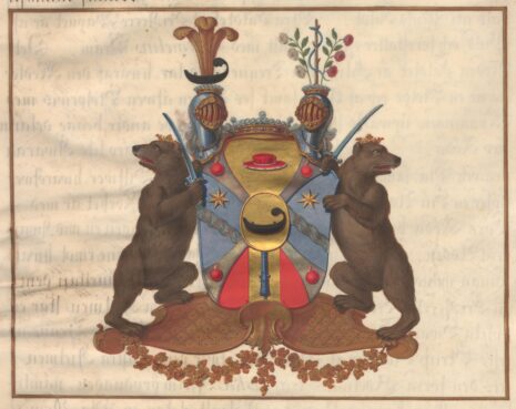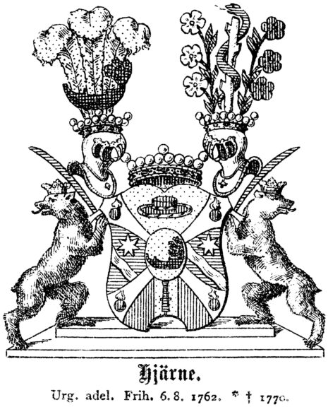 ”… En med ett utbögdt Twär Kors af Silfwer, eller med ett St Andreæ Kors från Hörnen Fyrstyckad Skjöld, uppå hwilcken en Oval Hjert Skjöld är lagd, som innefattar Stamwapnet, nämligen en Swart Bååt, på Bakstammen, till wänster med Fjädrar af samma Färg, Zirad, och Bielkewjs stäld uti Guld Fäldt. Öfra Fäldtet af FriHerre Wapnet är af Guld, och föreställer en Röd Hatt med Hermelins Bräm. Det Nedra Fäldtet är Klufwit i Trenne lika delar, hwaraf den Medlersta är en Stolpe och af Guld, samt ses deri en äfwen Stolpewis med Mynningen upwärts stäld blå Canon, men de andre begge delarne äro Röda. De högra och wänstra Fäldten äro like Hwarandra och Blå, samt föra Bandewjs en Ström af Silfwer, hwaröfwer Lyser en Sju Uddig Stjerna af Guld. Twär Korszet är med Fyra Röda brinnande Granater beprydt, nämligen en wid Hwardera Udden. Ofwan på Skjölden wisa sig Twenne emot hwarannan wände Öpne Krönte Tornere Hjelmar, och emellan dem en Fri Herrlig Crona. Uppå den Högra Hjelmen står en dylika Swart Bååt som i Stamwapnet, och der bakom Trenne upreste Strusz Fjädrar af Guld, men öfwer den wänstra Hjelmen sees den förra Adeliga Hiærneska Hjelmprydnaden, nämligen emellan Twenne bladrika Rosenstjelckar, en Blå Orm med Hufwudet mot Höger, slingandes sig Kring om en Qwistig Staf, och förer den Högre Rosenstjelcken Trenne Hwita, och den Wänstra Trenne Röda Roser. Skjäld Hållare äro Twenne Krönte Björnar af Naturlig Swartbrun Färg, som hwardera uti Högra Rahmen praæsentera en Dragen Sabel, med Blå Klinga och Silfwer Fäste. Aldeles som det samma med sina rätta och egenteliga Färgor här bredewid afmålat finnes.”