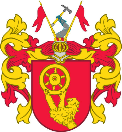 ”. . . Uthi ett rödt fälldt ett hallff guult leijon, stÃ¥endes opprätt, medh begge ramarne hÃ¥llandes ett hiuul aff samma färga och coleur. Där oppÃ¥ een förgyllt tornerehielm, hiellmtecket medh löfvärcket kring om sköllden medh gult och rödt fördeelt, och Ã¥fvan oppÃ¥ hiellmen emellan tvenne röda fahnor een beväpnadh arm, hÃ¥llandes uthi handen een stridzhammar, alldeles som be:te vapn medh sine egentlige färgor här afmÃ¥lat och repraesenterat ståår. . . .”