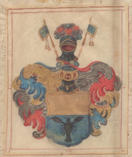 ..een twärt öfwer fördeelt Skiöld, hwilckas öfre felt ähr med Guld målat, men uthi dhet nedre, som ähr blått och medh silfwerstrimmor, ähr een Hummer med sine naturlige färgor och silfwer prickar på ryggen och i lederne; Ofwan på denne skiöld står een öppen Tornerhielm, warandes uppå dhensamma een öppen Casquet, medh Silfwer, röda och blå beblandande plumager derpå, På hwardera sijdan om casqueten står een Estandart af blå färga med Gullfransar och wippor; Löfwärket sampt Hielmetäcket ähr af Gull, Silfwer, rödh och blå ibland hwarandra fördeelte färgor, aldeles som dhet här hooβ afmålat står,…