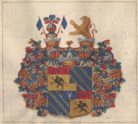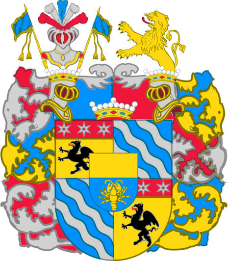 ”… En Skiöld fördelt i Fyra Fält och mitt utj den samma des förre Adelige Wapn, som i tweran utj twenne lijka delar är fördelt, den öfra delen är ett fritt Fält af Gull, utj den nedre delen står en uprätt Hummer af Gull i blått Fält; Men af sielfwa FrijHerrlige Wapnet är det Första Fältet af Gull, hwarutj wijsar sig een swart Grijp och der öfwer en röd chef Zijrat med trenne moletter af Silfwer. Det andra Fältet är Blått med Trenne Strömmar af Silfwer. Det Tredie Fältet är öfwer alt lijkt med det Andra, så och dhet Fierde med det Första. Åfwan på Skiölden stå Twenne öpne TornerHielmar med een FrijHerrlig Crona emellan sampt Een öfwer hwardera Hielmen; uppå Den Högra Hielm Cronan står en öpen casquet med Silfwer, blå och röda Plumager utzijrat, emellan Twenne Blå Estandarer, uthur den Wänstra Hielm Cronan upstijger öfre Delen af ett Gyllende Leijon, Löfwärcket är af Gull, Silfwer, Blått och Rödt, aldeles som detta FrijHerrlige Wapn med desz rätta och egentelige Färgor här hoos står afmålat.”