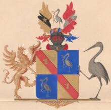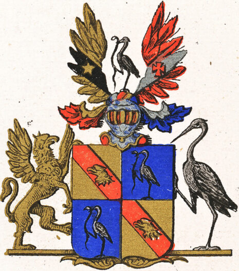 ”. . . En på gyldene fotställning upprättstående fransysk Sköld, som är klufwen och delad. I hwardera af första och fjerde fälten, som äro af guld, synes en röd Balk med derå ett Griphufwud af guld. I hwardera af andra och tredje fälten, som äro blå, synes en Stork af silfwer, hållande med näbben och högra foten en Orm af guld. På skölden hwilar en öppen Adlig Torherhjelm, som är till det inre röd, samt till det yttre af stål i naturlig färg, och har omkring halsen hängande en gyldene Kedja med derwid fästadt Smycke af guld. Hjelmen är betäckt med en af guld, blått, silfwer och rödt wirad Hjelmkrans, hwarpå är stående en Stork af silfwer, som med näbben och högra foten fasthåller en Orm af guld och är omgifwen af twenne från hjelmkransen utgående, uppåt sträckte, utspände Wingar. Uppå den högra wingen, som är af guld, synes en styckningswis gående swart Balk, som delar wingen i twänne lika delar och är belagd med en femuddig Stjerna af guld. Uppå den wenstra wingen åter, som är röd, synes en genstyckningswis gående, wingen likaledes delande Balk af silfwer, på hwilken ligger ett rödt Korsz, med inifrån utåt wigdade, lika långa och twärt afhuggna armar. Från sidorne, mellan hjelmen och hjelmkransen utgå twänne lätta Löfblad, det högra till det undre rödt och till det öfre af guld; det wenstra till det undre blått och ofwan af silfwer. Skölden uppehålles: till höger af en Grip utaf guld, åt skölden seende, med utspände wingar, af hwilka den wenstra hwilar mot sköldens öfra, högra hörn, och med högra bakfoten stående på sköldens fotställning, samt med de trenne öfrige fötterne hållande sköldens sidokant; till wenster af en Stork utaf silfwer, äfwenledes åt skölden seende, med wenstra foten stående på fotställningen, samt med den högra hållande midten af sköldens sidokant, aldeles som det med sina rätta och egentliga färger här afmåladt finnes.”