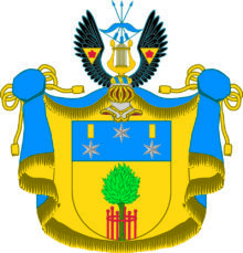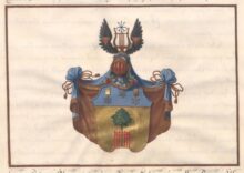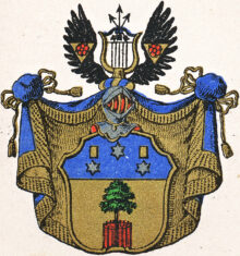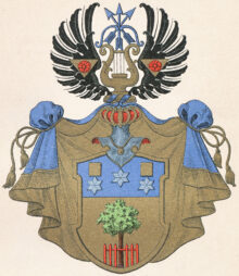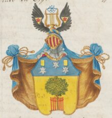 ”… En Gyllende Skjöld, hwaruti sees en Blå Chef, som wisar Trenne SexUddige Stjernor af Silfwer, stäldte En och Twå, eller sålunda att den ena Stjernan står mitt på Chefen, och de andre begge neder emot Kanten, warandes åter begge desze Ledsagade med Hwar sin ofwan om eller emot öfra Kanten uprätt stående Billette af Guld: Men i sjelfwa Fäldtet förekommer Ett Grönt Träd, omgifwit med en Pallisade af Sex Röda och åfwantill sammanbundne Paler. Åfwanpå den öpne Tornere Hjelmen är emellan Twenne Utslagne Swarta Wingar upstäld en Apollinis Lyra af Guld, Zirad åfwantill med en Upspänd Blå Flitzbåge och derpå Korszwis Lagde Trenne Pilar af samma Färg; Hwardera Wingen är belagd med en Gyllende TreKant, spitsen nerwänd, Hwilcken åter är öfwerlagd med en Röd Fembladig Roos. Krantsen är af Guld och Blått, och Wapentäcket är till Yttra sidan Blått men till den Inra af Guld. Aldeles som samma Wapen med sina rätta och egenteliga Färgor här bredwid afmålat finnes.”