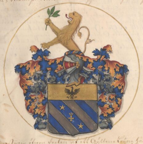 ”… Skiölden fördeelt i twäran utj twenne delar, det öfra Fältet som innehåller Een trediedeel af Skiölden är af Gull, hwarutj ståår een swart Örn, det nedre fältet är af Sölfwer, och dherutj trenne blå bander, ståendes i den medleste banden ett Crönt Kårs emellan twenne Stiernor af Gull, ofwan på Skiölden är en öppen Tornerhielm, hwaruthur opstijger öfwra deelen af ett Gyllene Leijon hållandes een grön Lagerqwist i högra rahmen Crantzen och Löfwärket är af Gull, Sölfwer och blått, aldeles som dhet här medh sine färgor afmåhlat och uthsatt finnes; …”