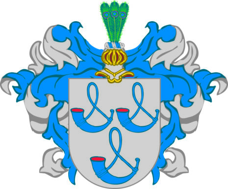 ”… een Sköld af Sölfwer, hwaruthi trenne blå Jägerhorn och ett blått hengiande band widh hwardera hornet, Ofwan på Skölden een öpen tornerhielm, hwaröfwer trenne Påfugelfiedrer af Naturell färg, Krantzen och löfwärcket af Sölfwer och blått, aldeles på Sätt och Wijs som dhet härhoos afmåhlat finnes.”