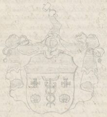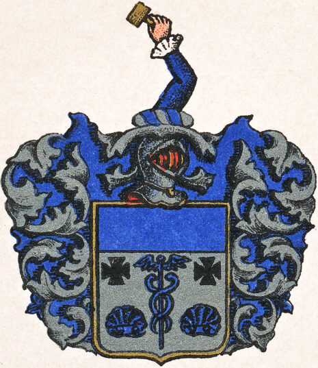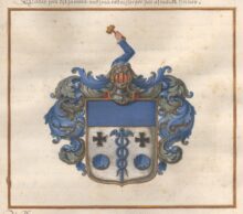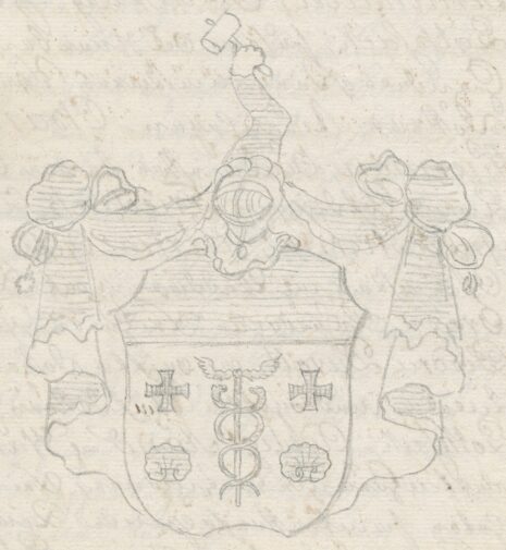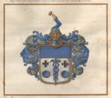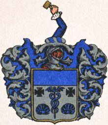 ”… En Silfwer-Skjöld, ofwantill Twärdelad med en blå Chéf, och der nedanföre uti Silfwer Fäldtet en uprätt stående blå Mercurii Staf, å hwardera sidan beledsagad med ett Swart Korsz, och derunder med en blå Musla. Ofwan på Skjölden ses en Öppen Tornere-Hjelm, och derutur upräckes en blå Höger-Arm, Hållandes i handen en Klubba af Guld. Hjelm Krantsen är wriden af Silfwer och Blått, och det Skjolden omgifwande Löfwärcket är likaledes af Silfwer och Blått. Aldeles, som det samma med sina rätta Färgor här afmålat finnes.”