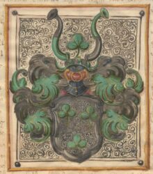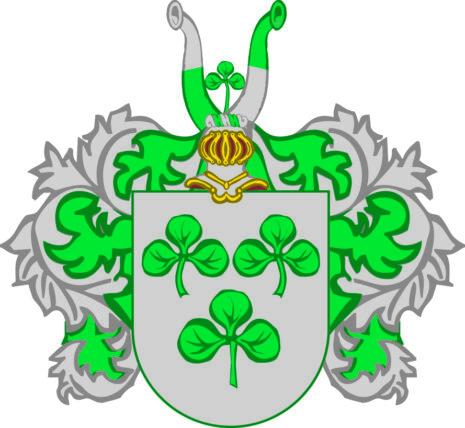 ”… Een Försölfradt Sköldh, vthj huilket Trij gröna Klöffwerbladh, Tw offwan och ett nedan före, mitt Vnder dee Tw öffwerste. Åffwan på Skölden een öpen Tornerehielm försölfrat, Crantzen och Hielmtäcket försölfrat och grönt. Åfwan på Hielmen ett grönt Klöfwerbladh emellan Tw Jägare Horn, Öffre delen aff Jägare Hornet på Högre sijdan försölfrat, Nedre delen grön, Öfre delen aff Hornet på Wänstre sijdan grön, Nederdelen försölfrat. Löffwärcket Hwitt och grönt, aldeles såsom thet medh sine egentelige färgor här repræsenterat och affmåhlat står.”