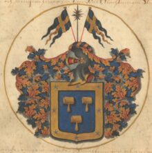 ”… een blå Skiöld hwaruthj wijsar sigh Trenne Musskuhler af Gull, kring Skiölden löper een bord af Gull Zijrat medh Åtta blå Stiernor. Ofwan på Skiölden står en öppen Tornerhielm, hwaröfwer står een Morgon Stierna emellan Twenne Swänska Cronflaggor af deras behörige Färgor, Crantzen och Löfwärket är af Gull och blått, aldeles som detta Wapnet medh sine rätta och egentlige Färgor här hoos repræsenterat och afmåhlat står; …”