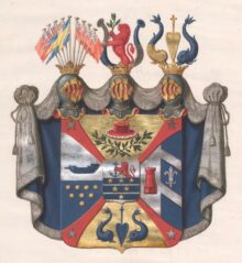 ”… En Sköld, fördeldt i fyra delar genom ett rödt i desz ändar med en silfwerstjerna beprydt Andreæ eller twerkors. I öfwersta fältet, som är af gull, ses en röd Riks-Råds hatt med Hermelins bräm, och under densamma twenne i kors lagda gröna Lagerqwistar. Högra fältet innefattar Psilanderska wapnet, eller är på tweran deladt i tu, och i desz öfra del ett blått Skepps-skrof, samt i den nedra åtta Kulor af gull, fyra, tre och en satte. Wenstra fältet åter innehåller det Ehrenhoffska wapnet eller är klufwet i tu med ett rödt Fästningstorn i desz högra del: den wenstra deremot blå och styckad i tre lika delar genom twenne band af silfwer, emellan hwilka står en Fransk Lilja af samma metall. I nedersta fältet, som är af gull, ses ett blått antikt Roder, emellan twenne blå Delphiner med uppresta stjertar. Midtpå förenämda Andraæ-kors är fästad en Hjertsköld med Ättens ur-wapen: en Sköld af silfwer, hwilken genom en blå bjelke, som af twenne dylika åtföljes, är delad till en bred Ginstam eller Chef, hwaruti till hälften uppstiger ett till höger wändt rödt Lejon, hållande i ramarna ett blått Skepps-ankare. Den öfra af nämnda bjelkar är belagd med tre, den medlersta med twå, och den undra med en stjerna, alla af gull. På Skölden stå tre öppna Tornerhjelmar, prydda med Grefliga kronor. På den medlersta hjelmen uppreser sig, emellan twenne af silfwer och blått på tweran fördelta utåt böjda Buffelhorn, ett rödt Lejon, hållande i högra ramen en grön Lagerqwist med tre blad. Ur den högra står upprätt en till höger blåsande Swensk Örlogsflagga emellan åtta Engelska, hwaraf fyra åt hwar sida och utåt fläktande. På den wenstra åter står ett gyllene antikt Skeppsroder emellan twenne Delphiner, af hwilka den högra är till öfra hälften blå, nedra hälften af gull; den wenstra Delphinen dermot blå. Skölden omgifwes af en Wapen-mantel, utwändigt af silfwer, innantill blå; Alldeles såsom detta Wapen här ofwan med sina rätta och egentliga färger afmåladt finnes.”
