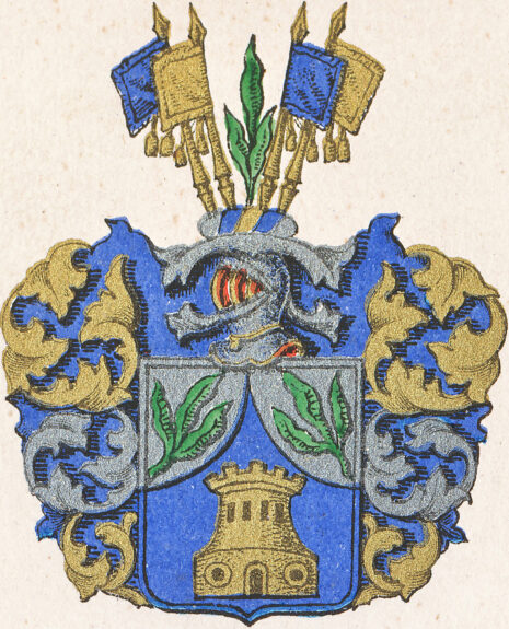 ”… En Adelig Skiöld, med twenne Spetzigt upgående streck fördelt i trenne Fält; hwaraf de twänne öfre äro af Silfwer, med en grön Lagerqwist af tre blader, uti hwartera; och det ena nedre, blått, med en Borg däruti af gull: Ofwanpå denne Skiöld wisar sig en öppen Tornerhielm, hwarutur upstiger en Lagerqwist, lika med den som i skölden finnes, emellan fyra Estandarer, med gull och blått hwar om annan fördelte; blifwande Crantzen och Löfwärcket af gull, silfwer och blått, aldeles som afmålningen till alla delar här jemte finnes …”