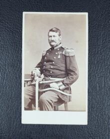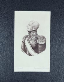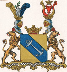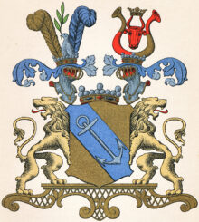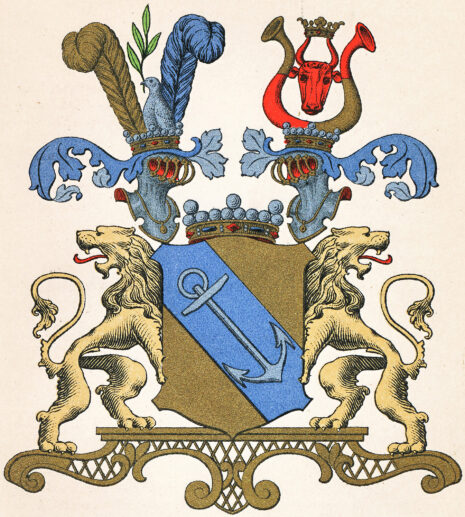 ”. . . En gyllene sköld, belagd med en blå bande, hvaruti i lika ställning ses ett ankar af silfver med uppåt vettande stock och ring. På skölden hvilar en friherrelig krona emellan 2:ne med dylika krönta öppna tornerhjelmar, af hvilka den högra bär ättens förra hjelmprydnad: en sig uppresande till höger vänd hvit dufva, uppåt hållande i näbbet en fyrabladig grön oliveqvist och stående framför 2:ne åt hvar sin sida fallande strussfjädrar, den högra af guld men den venstra blå. Öfver venstra hjelmen ses ett rödt, midt framåt vändt oxhufvud, på hornspetsarna förande en gyllene krona och stäldt emellan 2:ne till hvar sin sida utåt vände buffelhorn, på tveran delade och sins emellan vexlande af guld och rödt. Skölden hålles af 2:ne lejon af naturlig färg med utåt vända hufvuden, utsträckta tungor och upplyfta svansar samt stående på en af gyllene ornamenter omfattad fotställning af porfyr; alldeles såsom vapnet här med sina rätta och egentliga färger afmåladt finnes. . . .”