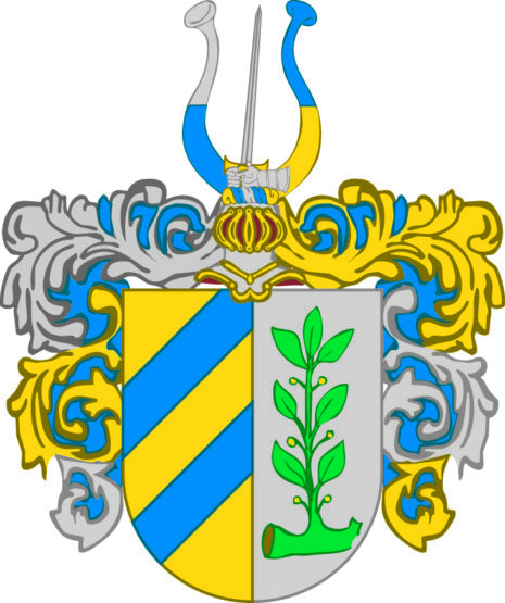 ”… En fördeelt Sköldh, den ena deelen moot höger guhl och den andre emoot Wänster hwijt. Vthj den guhle twenne Blåå Biälckar liggiande snedt öfwer, och Vthj den hwijte en wäxande Lagergreen, ofwan opå Skölden en open Tornerehiälm, Crantzen och hiälmtäcket sampt lööfwärket medh blått, guhlt och hwitt fördeelt, ofwan opå hielmen, twenne oprättstående Horn, af hwilcke det högre är medh hwitt ofwan och blått nedan, och det wänstre medh blått ofwan och guhlt nedan, fördeelte; Emillan hornen en bewäpnat hand hållande ett oprätt dragit swärd; Aldeles som sielfwa wapnet här mitt opå medh, sine egändtlige färgor reprasenterat och afmåhlat ståår;”