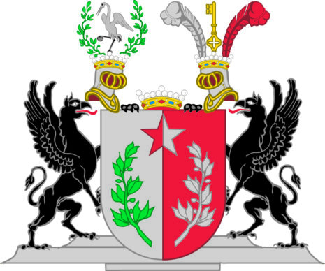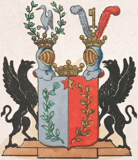 ”… En midt i tu klufwen Sköld, hwars högra Fält är af Silfwer och det wänstra rödt. I hwardera fältet är uprest en Lagerqwist, den till höger grön, och den till wänster af Silfwer. Öfwerst tindrar en femuddig Stierna, midt i tu klufwen med skölden, hwilken wäxlar färg med hwardera fältet. Skölden är betäckt med en Friherrlig Krona, stående emellan twänne öpna och mot hwarannan wända Tornerhjelmar, hwarje prydd med en Friherrlig Krona. Från den högra reser sig en wakande Trana af naturlig färg, med utsträckta wingar, wändande sig till höger, emellan twenne små gröna Lagerqwistar, och hållande i sin ena uplyfta fot en sten. Den wänstra Hjelmen äger till prydnad twenne Strutsfjedrar, den ena hwit, den andra röd, emellan hwilka står uprest en gyldene Nyckel. Skjölden understödjes af twenne swarta Gripar, stående på en fotställning af Silfwer; Alldeles som det med sina rätta och egenteliga färgor här afmåladt finnes.”