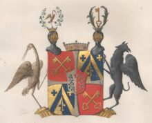 ”… En medelst ett utböjdt korss af Silfwer klufwen och delad Sköld, belagd på midteln af Korset med en klufwen Hjert-Sköld, hwars högra Fält är af Silfwer och det wenstra rödt; i hwardera Fältet är uprest en Lagerqwist, den till höger Grön och den till wenster af Silfwer. Öfwerst tindrar en femuddig Stjerna, midt i tu klufwen med Skölden, och wäxlande färgen med hwardera Fältet. I den Friherreliga Sköldens öfra högra och wenstra nedra Fält, som äro röda, wisa sig twenne bande- och barrewis öfwer hwarannan lagde gyllene nycklar. I det wenstra öfra och högra nedra, en Sparre följd af twenne korss, och nedanom Sparren en Lillja; warandes dessa Fält på det sättet klufna, att högra delen af Sparren, högra Korsset och högra hälften af Liljan äro blå i Gull-Fält, och den wenstra delen af Sparren, wenstra korset och wenstra halfwa Liljan, af Gull i blått Fält. Ofwanpå Skölden hwilar en Friherre-Krona af Gull emellan twenne öppna Torner-Hjelmar, äfwen betäckta med hwar sin Friherre-Krona. På den högra står uprest en wakande Trana af naturlig färg, med utslagna wingar, wändande sig till wenster, emellan twänne grönskande Lagerqwistar. Ifrån den wenstra Hjelmen upwäxa twenne gröna Palmqwistar, emellan hwilka en Gyllene nyckel uprätt står. Skölden stödjes till höger af en Trana, med hufwudet bakåt eller til höger wändt och af naturlig färg; til wenster af en jemwäl bakom sig seende swart Grip, hwilka begge Sköldhållare stå på en prydlig fotställning af Gull. Aldeles som det här ofwan med sina rätta och egenteliga färgor afmålat finnes.”