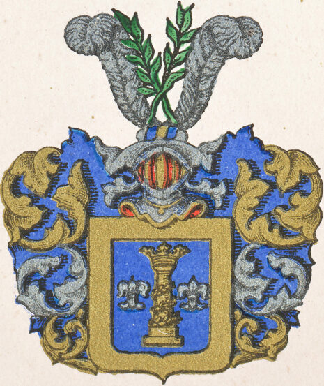 ”. . . En blå Skiöld, hwaruti står en krönt Stolpe af gull, omwefwad med en gyllende Lagerqwist, emellan twenne Lillior af silfwer; runt omkring Skiölden löper en smal Bord af gull; Ofwan på Skiölden är en öppen Tornerhielm, hwar öfwer äro twänne korswijs lagde gröna Lagerqwistar, emellan twänne försilfrade Strusz fiädrar; Crantzen och Löfwärcket är af Gull, Silfwer och Blått; aldeles som detta Wapn med sina egentel. färgor här afmålat står.”