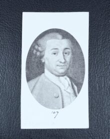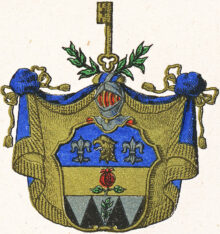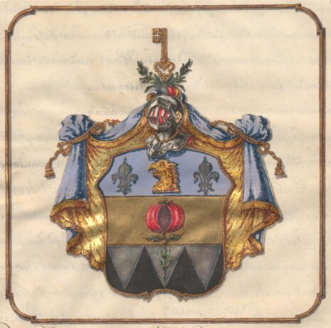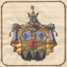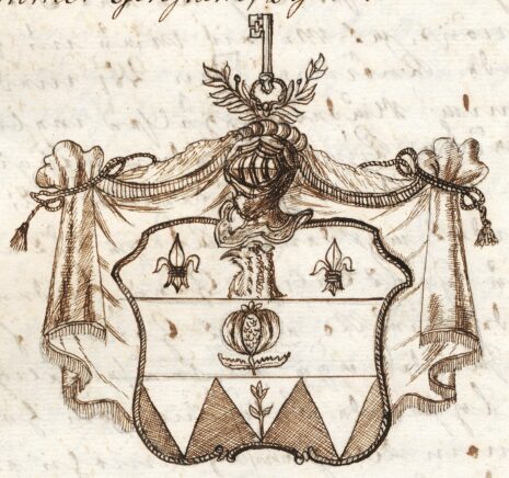 ”… En Twenne gånger delad Skjöld, hwarigenom upkommer Gen-Stam, Bielke och Stam. I Chefen eller Genstammen som är Blå, wisar sig ett åt höger wändt Grip-Hufwud af Guld, sidosatt med Twenne Liljor af Silfwer. På bielken som är af guld, är ett rätt upstående samt upskurit Granat äple af röd Färg, med grön stielck och blader, stäldt. I Stammen ses 3ne wid hwardera i bredd, samt ned åt fäldte Strålar af Silfwer i swart Fäldt, den medlersta strålen är belagd med en rätt upstående Fembladig OlifweQwist hwilcket är en del af desz Möderne-wapn. På Skjölden står en Öppen TornereHielm täckt med en af Guld, blått, Silfwer och rödt wriden HielmKrantz, hwarpå 2ne gröna LagerQwistar Korswis äro lagde, emellan hwilcka en gyllende Nyckel är uprest. HielmTäcket är blått underfodrat med Guld, Kantat och upbundit med Gyllende Frantzar och Snören; Aldeles som det samma med sina rätta Färgor härhos afmålat finnes.”