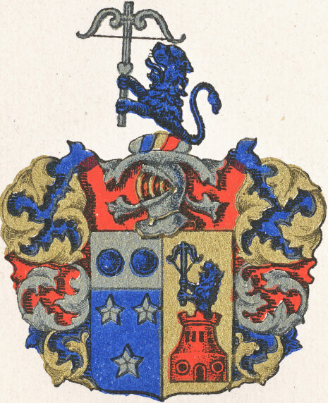 ”… En Skiöld i längden fördelt i twenne lika delar, warandes det högra fältet blåt, hwaruti lysa trenne Stiernor af Silfwer, öfwerst i fältet är en silfwer Chef med twenne blå kulor uti, det wänstra fältet är af gull, hwar uti står en röd borg, utur hwilken upstiger öfre delen af et blåt Leijon, hållandes en båga med Ramarne. Ofwan på Skiölden står en öpen Tornerhielm, öfwer hwilken et slikt blåt Leijon som i sielfwa Skiölden är, upstiger med en båga i Ramarne, Crantzen och Löfwerket är af gul, silfwer, blåt och rödt, som detta wapen med sina rätta och naturliga färgor här hos afmålat finnes.”