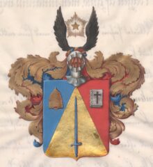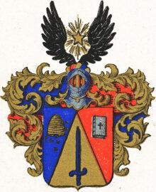 ”… En Fransk Sköld, belagd med en gyllene spets, hwari står upprätt ett blått draget swärd. I högra fältet som är blått, ses en gyllene bikupa med sitt fluster, omgifwen af flygande gyllene bin. Wenstra fältet deromot är rödt och deruti en med ryggen åt höger wänd bok af silfwer, utanpå permen tecknad med ett aflångt swart kors. På skölden hwilar en öppen Tornerhjelm, prydd med en af guld, blått och rödt sammanwriden hjelmkrans, hwaröfwer swäfwar en af gyllene strålar omgifwen femuddig stjerna af guld, emellan twenne utåt fläktande swarta wingar. Löfwerket, som omfattar skölden, är i dagen af guld, men innatill wexelwis blått och rödt; Alldeles såsom Wapnet här med sina rätta och egentliga färger afmåladt finnes.”