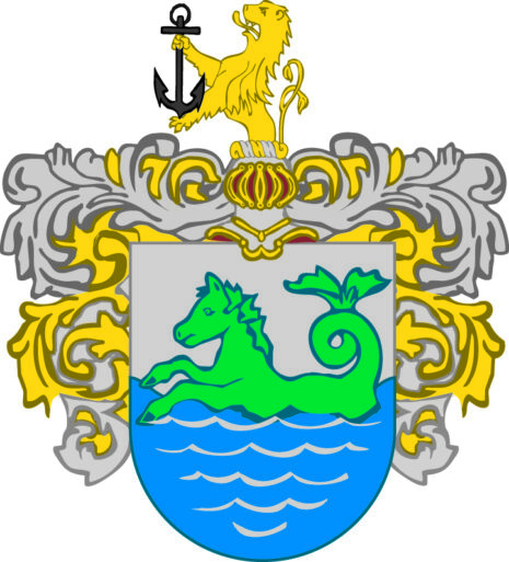 ”… En hwijt skiöldh, där uthi en Siöhäst af Siögrön färga, kommandes uthur Watnet medh hufwudet, begge framfötterne och Stiärten, och warandes i action till att simma. Öfwen oppå skiölden ett halft förgylt Leijon, hållandes framman för sigh på sijdan medh både Fötterne ett Anckar oprätt ståndandes, medh sin natürlige färga, täcket och Krantzen medh guult och hwijt fördelte, alldeles efftersom och ett sådant skiöldemärke här hoos exprimerat och afmåhlat står; …”