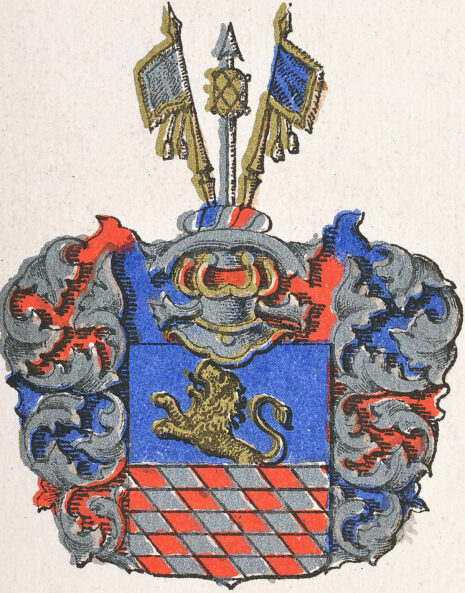 .. Skiölden fördeelt i twäran uthi twänne Lijka delar, dhet öfra fältet är blått, hwar uthj ett halfft Leijon af Gull, dhet nedra fältet är i snedden Ruthewijs fördehlt, warandes Ruthorne med Sölfwer och rödt, hwar om annan förstälte, Ofwan på Skiölden är en öppen Tornerehielm, hwar öfwer står en Stormspetz emillan 2:ne Estandarer, af hwilka den högre är af Gull och den wänstra blå, Crantzen och Löfwärket är af Gull, Sölfwer och blått, hwart om annat bemängdt, alldehles som sielfwa Wapnet med sine rätte och egentlige färgor här hoos tecknadt och afmåhlat står;..