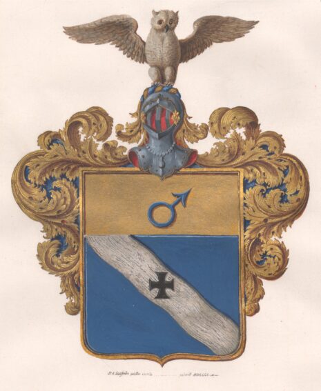 ”… En Sköld i hwars öfra del, som är en Chef af guld wisar sig ett Martis tecken af blå färg, men i hwars nedra, som är blå, från öfra högra til nedra wenstra hörnet bandewis löper en Ström af Silfwer, belagd med et swart kors. Den öpna Tornerehjelmen är betäckt med en hjelmkrans, wriden af guld och blått, hwaruppå hwilar en framåt wänd Uggla med utsträckta wingar af naturlig färg. Hjelmtäcket eller det så kallade löf-werket är utantill af guld och innantill blått, alldeles såsom detta Wapen med sina rätta och egenteliga färgor här afmåladt finnes.”
