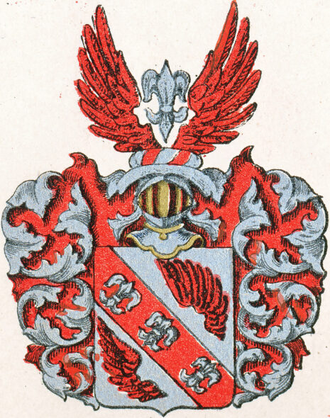 ..Ett hwitt fällt, offwan ifrån högre och neder till Wänster fördelt medh een rödh giördel, den medh tree hwite Lillior beprydes, och på hwardere sijdan om giördelen een rödh winge uppå Skiölden een öppen Tornerhielm medh Vinghängande Löffwerk aff hwitt och rödh färga, och så äfwn opå Hiälmen xxx Wingar medh een hwijt Lillia däremillan, aldeles som det här medh sijne rätte färgor uthsatt och affmåhlat ähr…