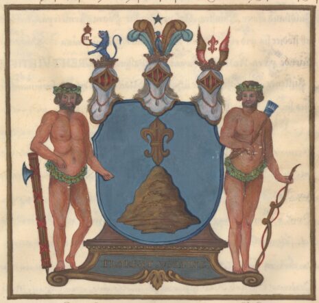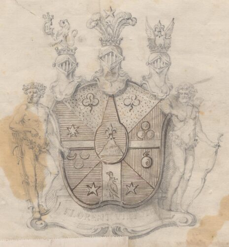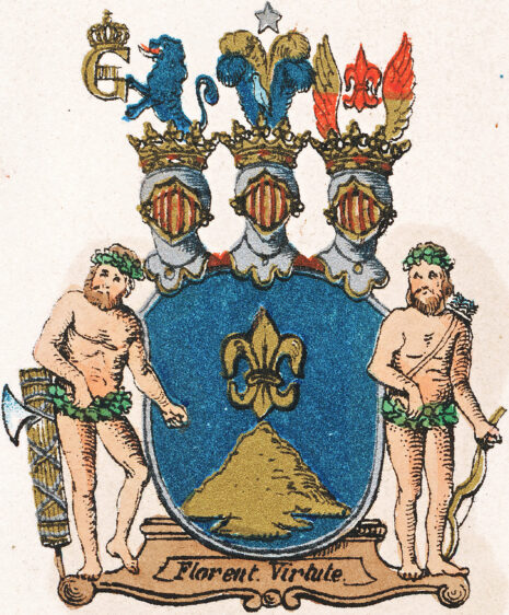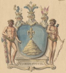 ”… En Blå Skjöld, och deruti det egentliga Stam Wapnet, som är ett Gyllende fritt stäldt Berg, öfwer hwilcket swäfwar en Fransk Lillja af Guld. Uppå Skjölden äro Trenne med Grefwelige Cronor Krönte Opne Tornere Hjelmar; Den Medlersta Hjelm Cronan är prydd med Fyra Strusz Fjädrar; De medlerste 2ne af Guld, och de Yttre blå, emellan Hwilcka ses en till Höger wänd blå Hök, med Rödt band om Halsen, Öfwer hwars hufwud swäfwar en Femuddig Stjerna af Silfwer. Utur den Högra Hjelm Cronan upstiger till Hälften ett till Höger wändt Blått Leyon Hållande i Högra Ramen Wårt Namns Chiffre GIII med Kongl: Crona alt af Guld: Och uppå den Wänstra Hjelmen, ses emellan Öfre delen af Twenne Utslagne, samt med Guld och Rödt Wäxelwis fördelte Wingar, en Röd Fransk Lillja. Skjöldhållare äro med Krantsar och Lifbälten af Gröna Ekelöf Zirade Wildmän: Den till Höger hwilar sin Högra Arm på de Romerske Fasces af Guld, med Purpurband Omlindade, och den till Wänster, som bär på Ryggen ett Blått Koger med Guldband öfwer Wänstra Axlan, Hwilar Högra Armen på Skjölden, och stödjer sig wid en Flitsbåge af Guld med Purpusträng: Bägge stående på en Piéd’ Estal, Hwarå desz Walspråk, FLORENT VIRTUTE, i Gyllende Bokstäfwer står utsatt. Aldeles som det Här frammanföre med sina egenteliga Färgor afmålat finnes.”