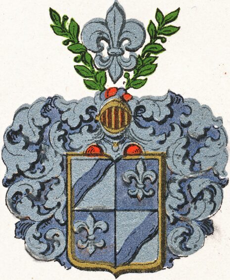 …..ett sådant Sköldemercke förähra såsom dedt här med sine egentlige färgor afmålat står, nembligen Skölden eller fielden fördeelt i fyra deelar där af den förste och sidste ähre hwijta, medh hwar sin blå gönom rinnande ström, den andre och tredie blå medh hwar sin hwitjt lillia, Öffuan på Skölden en öpen Tornerhielm, Täcken och Krantzen medh hwitt och blått fördeelt, offuan på hielmen en hwijt Lillia mellan twå Oliwe Qwistar Vthi deras Naturlige ferga.
