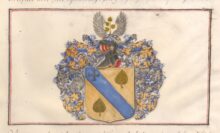 ”… en Skiöld af gull med 2:ne gröna Lindelöf uti, hwar emellan går en blå Bande, Zirat i öfwersta rummet med ett korss af Silfwer: Ofwan på Skölden står en öpen Tornerhielm, hwarutur upstiger een grön Lindeqwist emellan twänne försilfrade wingar. aldeles som sielfwa Wapnet med sine egentelige färgor här hos står afmåhlat.”
