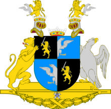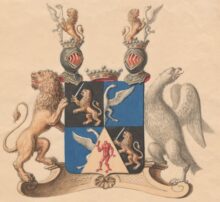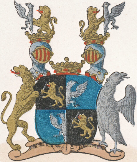 ”… En fyrdelad Sköld, hwars Öfra Högra och Nedra Wänstra fälter äro swarta, och deruti wisa sig i hwardera ett emot Höger gående uprest Leijon af Guld, förande i högra Ramen ett dragit Swärd af Silfwer. Men de öfra Wänstra och Nedre högra Fälten äro Blå, och i hwardera förekommer en half Fläkter Örn af Silfwer, på det sättet stäld, at i det Öfra sluter den sig till högra kanten och wänder sig emot wänster, men i det undra sluter den sig til Wänstra kanten, och wänder sig emot höger. Ofwan på Skölden står en Friherre Krona, och på hwardera sidan därom, en, äfwen med Friherre Krona krönter, öppen Tornere hielm. Utur den högra hjelm kronan upspringer emot höger ett halft Leijon af Guld, som emellan bägge ramarne förer framför sig en half fläkter Örn, likaledes emot höger wänd, af silfwer; Och utur den wänstra hielm Kronan upspringer ett lika Leijon af Guld med sin halfwa Örn emellan ramarne, men altsammans emot Wänster wändt. Sköld hållare äro til höger, ett modigt sig tilbaka seende Leijon af Guld och til Wänster en Örn af Silfwer, med utwändt hufwud, Nebb och klor af Guld, aldeles som detta Wapn med sine rätta färgor här hos afmålat finnes.”