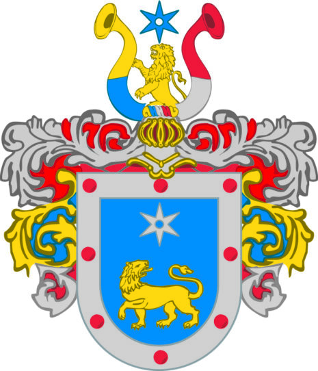 ”… En blå Sköld, hwaruti går ett tilbakaseende gyllende Leijon, under en silfwer mollet: rundt omkring Skölden löper en Bord af Silfwer, Zirad med åtta röda Kuhlor. Ofvanpå Skölden står en öppen Tornerhjelm, hwarutur upstiger öfre delen af ett gyllende Leijon med en blå molett på hufwudet, emellan twenne Buffelhorn af gull och blått, silfwer och rödt, i twäran fördelte. Crantzen och Löfwärcket af gull, silfwer, blått och rödt, aldeles som detta Wapn med sine egenteliga färgor här afmålat står.”