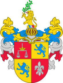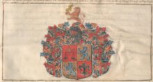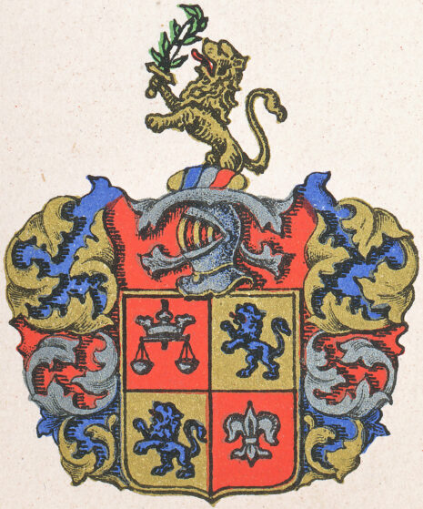 ”… En Skiöld, genom ett Strek i längden och ett i twären, fördelt i fyra lika delar. Det öfre högra Fältet är af röd Färg, hwaruti sees en iämtwägande krönt Wichtskål af Silfwer. Det andre Fältet är af Gull, i hwilket står ett blått Leijon. Det tredie Fältet är uti alt lika med det andra: Med uti det Fiärde Fältet, som äfwen är rödt, wisar sig en Lilja af Silfwer. Ofwan på Skiölden står en öpen Tornerhielm, hwar utur opstiger öfre delen af ett gyllene Leijon, som med högre Ramen håller ett Swärd, omwefwat med en grön Lagerqwist. Krantzen och Löfwerket är af Guld, Silfwer, blått och rödt, aldeles som detta Wapen med des egenteliga Färgor här hoos afmålat finnes.”