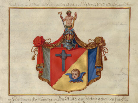 ”… En Skjöld, ginstyckad genom en fin Sågskura i Twenne lika delar. I det öfra röda Fäldtet ligger ett Korss af Silfwer, omkring hwilckets öfra del är lindad en utaf Twenne Qwistar wriden Törne Krantz af Naturlig Färg. I det undra Fäldet af Guld, ses en Cherubim med utsträckte blå wingar. Ofwan på Skjölden ses en öppen Tornere Hielm, hwarifrån upstiger öfra halfwa delen af en Willman, hållande i högra Handen en Biskopsstaf af Silfwer, hwars Krycka är af Guld, och i den wänstra handen sin Willmans Klubba, ned fäld emot Hielmen. Hielm Krantzen är wriden af rödt, Silfwer, blått och Guld. Skjölden omgifwes af ett Wapentäcke, som till Höger är utantill rödt och på den inra sidan af Silfwer, men till Wänster är utantill af Guld, underfodrat med blått, Zirat och upbundit med Gyllende Frantsar och Snören. Aldeles som det samma med sina rätta Färgor här frammanföre afmålat finnes.”