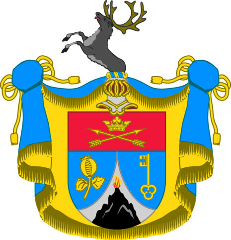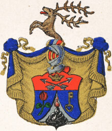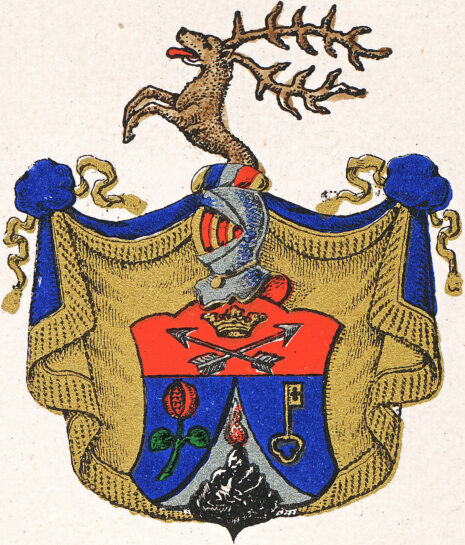 ”… En Skiöld mitt uppå ifrån åt höger och wänster, swängd-Klufwen, hwaraf uti det medlersta Fäldtet, som är af Silfwer, står ett swart utur Spitzen brinnande Berg: Men af bägge blå sido-klyfterne är den högre Zijrad med ett Gyllende granat-äple, och den Wenstre med en Guld-Nyckel. Ofwanföre är en Röd Chef, Hwarutinnan en GuldCrona med twenne där in under Korswis, lagde Gyllende Pihlar sig wisar. Uppå skiölden står en Öppen TornerHielm, Hwarutur upstiger Öfwer-dehlen af en Rehn Naturlig färg. Hielmtäcket och Crantzen är af Guld och Blått: Alldeles som detta Wapn med deβ egentliga färgor härbredewid afmåhlat finnes.”